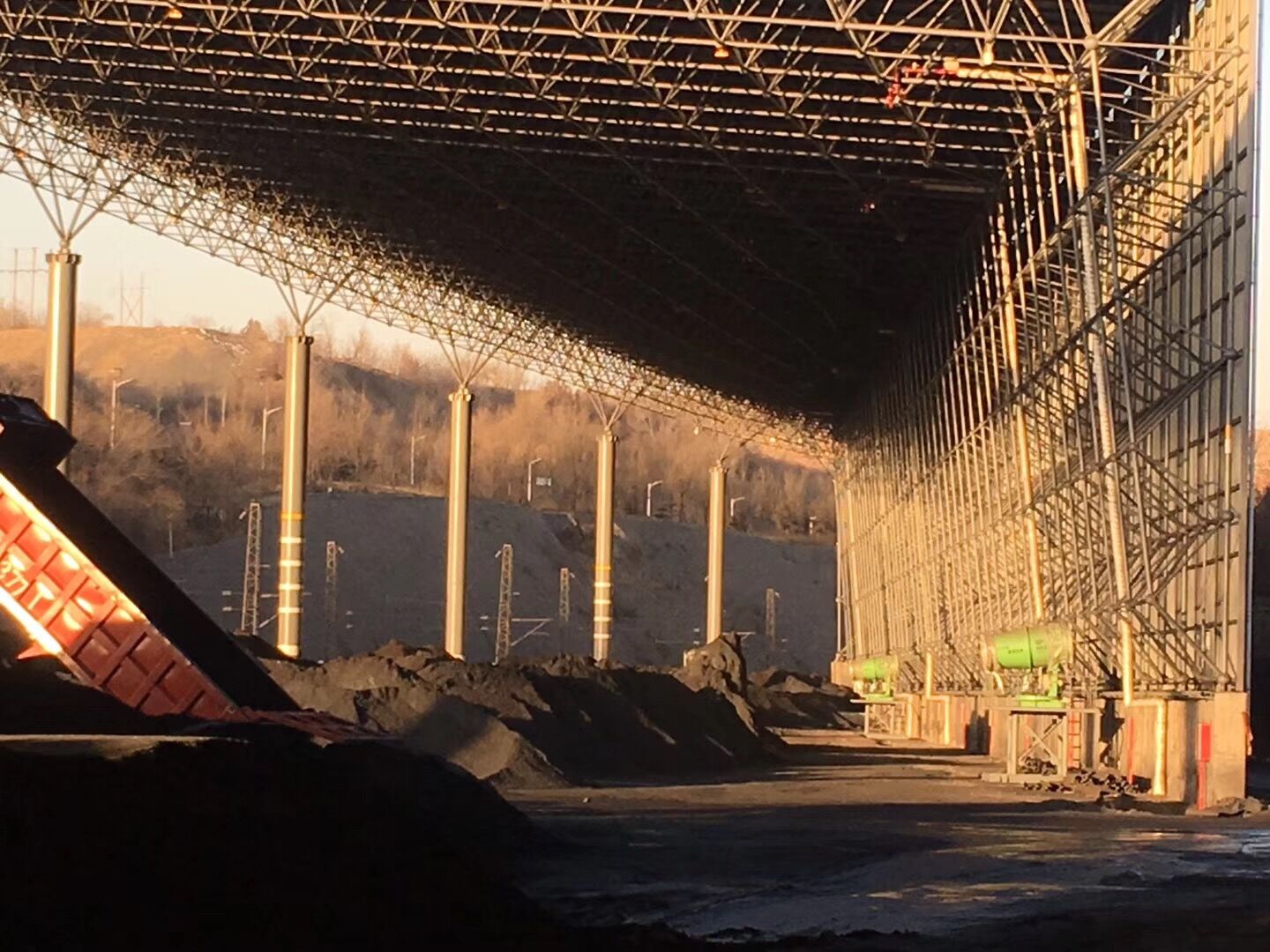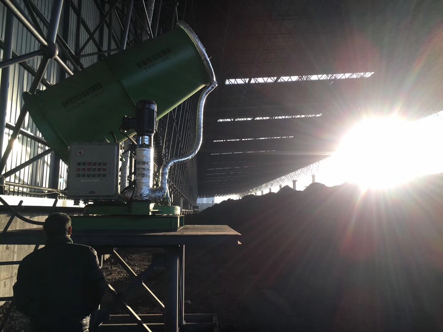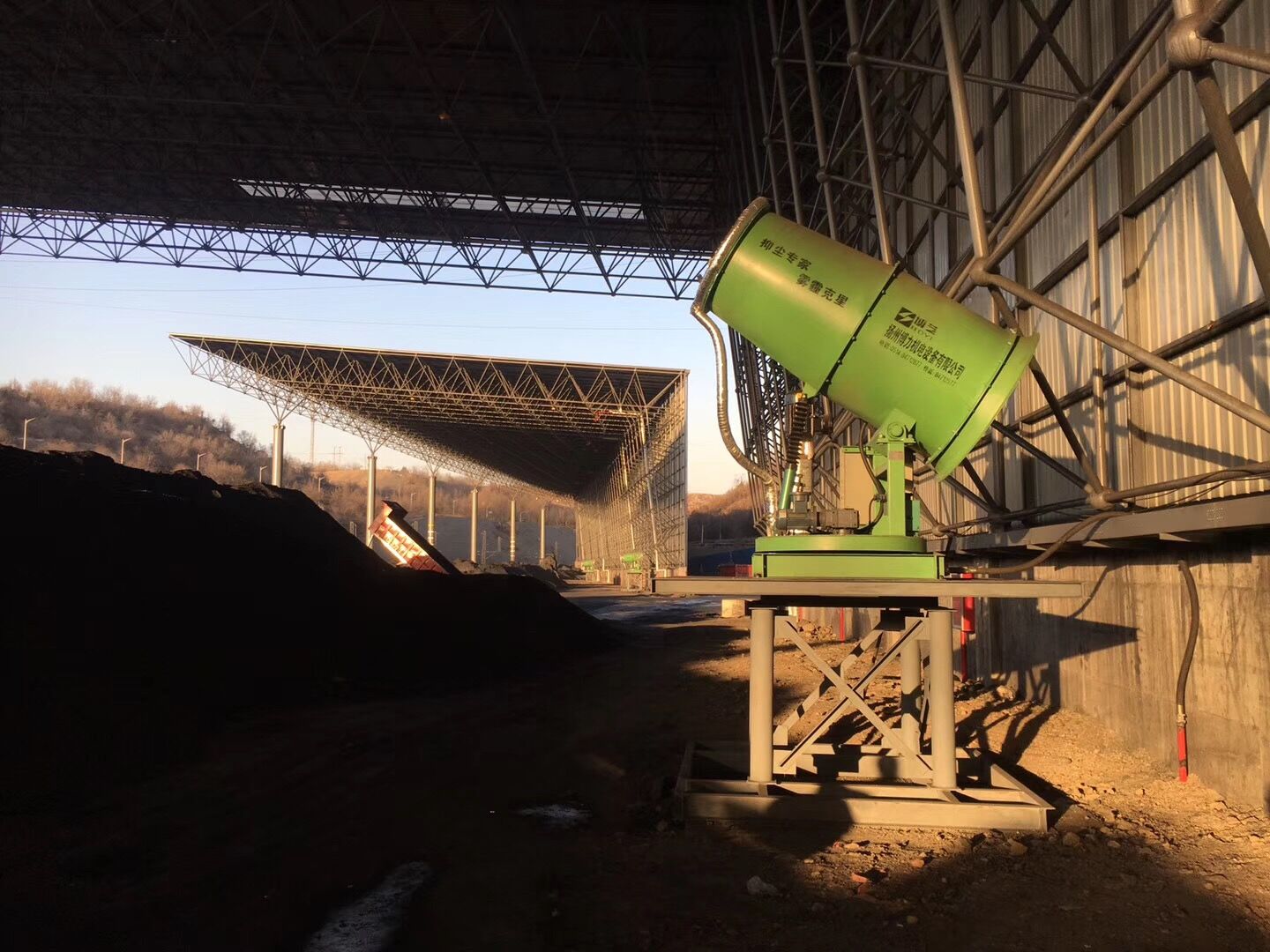 項(xiàng)目地位于山西省陽泉市經(jīng)濟(jì)技術(shù)開發(fā)區(qū)下五渡,陽泉天成煤炭鐵路集運(yùn)有限公司儲(chǔ)煤棚,煤場有南北兩個(gè)貨場儲(chǔ)煤棚,南貨場儲(chǔ)煤棚使用8臺(tái)FCK-HB80防寒防爆型智能粉塵控制器和2臺(tái)BL/FCK-HB100防寒防爆型智能粉塵控制器全方位噴霧降塵除塵。北貨場儲(chǔ)煤棚使用12臺(tái)BL/FCK-HB50“博藝”牌防寒防爆型智能粉塵控制器全覆蓋噴霧抑塵。